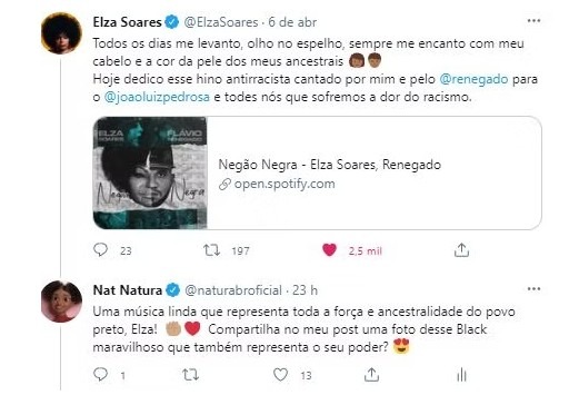 A cantora Elza Soares também postou sobre o ocorrido em sua página, interagi com ela pedindo para compartilhar uma foto com seu cabelo para darmos RT na nossa página. Ela topou, nos respondeu e postou uma foto mostrando sua força.